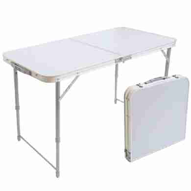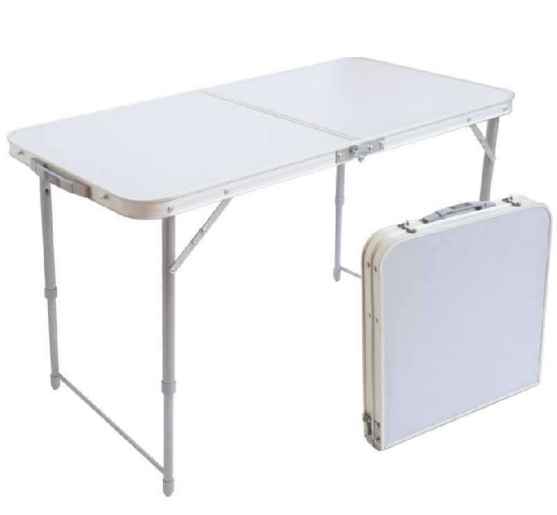 Стол складной с алюминиевой окантовкой. Цвет и некоторые незначительные детали могут отличаться от изображения. Два положения высоты: 445 мм и 610 мм. Материалы: профиль алюминиевые, ножки сталь, МДФ, пластмасса.