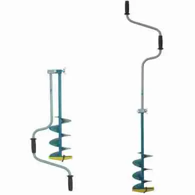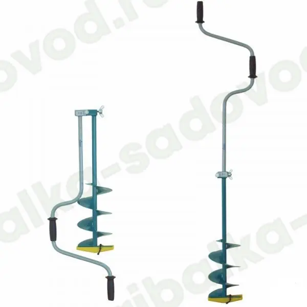 Основное и единственное отличие двуручных ледобуров от классических – верхняя рукоятка ледобура смещена относительно оси ледобура на 130 мм, а нижняя на 150 мм. Такое расположение рукояток позволяет вращать ледобур одновременно двумя руками, тем самым, увеличивая скорость бурения лунок во льду. Кроме того, существенно уменьшаются габариты ледобура в транспортном положении. По всем остальным характеристикам двуручные ледобуры полностью соответствуют классическим. Диаметр бурения – 180 мм, глубина бурения – 1000 мм. Вес ледобура – 2.9 +/-0.2 кг.