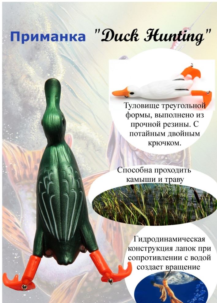 Duck Hunter обладает хорошей и четкой игрой. Он уверенно скользит по воде, разрезая толщу во время проводки. Рекомендуется слегка подергивать кончик удилища это даст приманке возможность немного заныривать на небольшую глубину, а также спокойно проходить заросшие участки водоёма. Отдельно стоит отметить, что конструкция позволяет совершать как быстрые, так и медленные плавные проводки. Как и свойственно настоящей утке, у приманки Duck Hunter по бокам есть две лапки, которые вращаются во время проводки. Двигаются вне зависимости от скорости подмотки лески, а также создают необходимое акустическое сопровождение, приманивающее больших хищных особей. Благодаря этому щуке кажется, что мимо неё проплывает раненый или отбившийся от стаи утёнок.