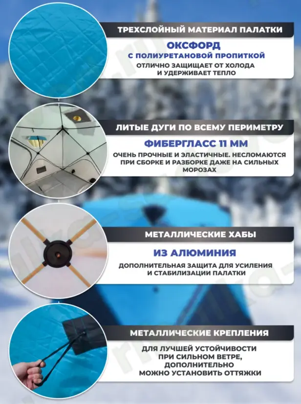 Дуги палатки изготовлены из прочного стеклопластика диаметром 9,5 мм, что обеспечивает устойчивость, надежность и легкость всей конструкции. Одной из особенностей данной зимней палатки является её небольшой вес - всего 14 кг, что значительно облегчает транспортировку. Качественная фурнитура и быстрая сборка (всего несколько минут) делают эту модель особенно привлекательной для любителей зимней рыбалки и походов. Также в комплекте предусмотрены необходимые петли для дополнительных элементов крепления.