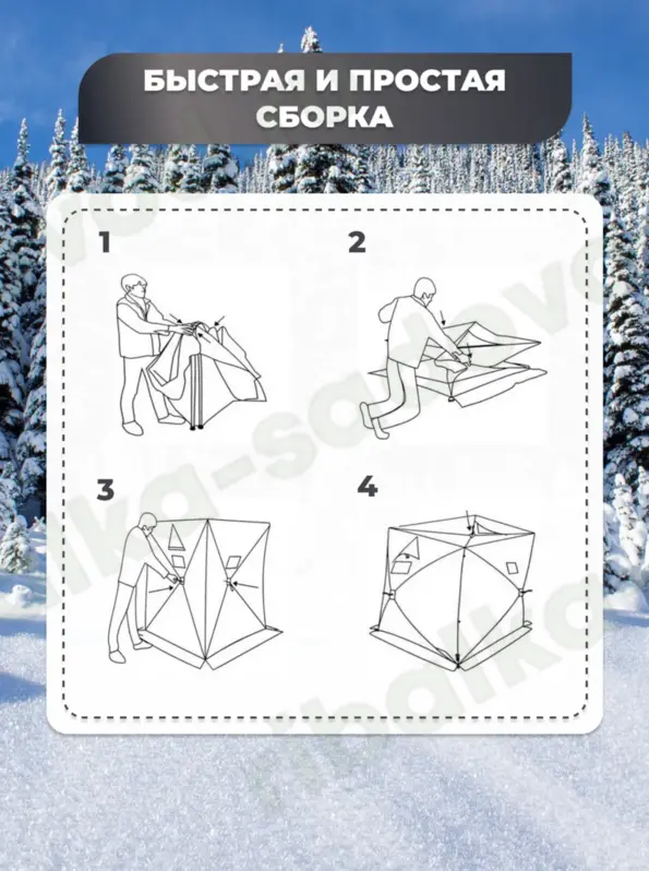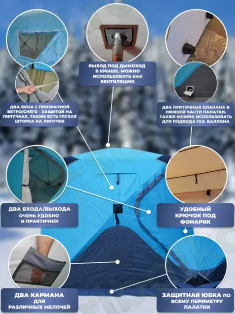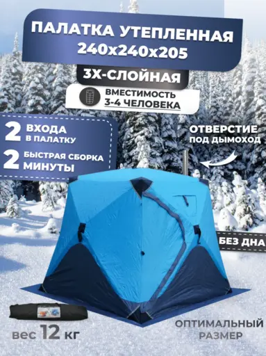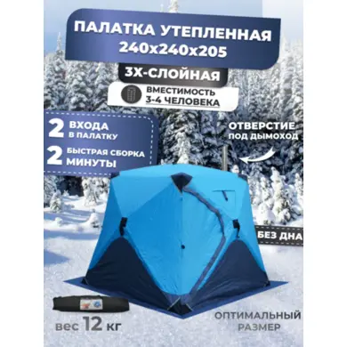 Зимняя утепленная палатка обеспечивает комфортное пребывание на природе и на льду в холодное время года, отлично подойдёт для туризма, отдыха, зимней рыбалки и охоты. Её размер составляет 240 х 240 х 220 см, а материал тента - влагозащитный Oxford 300D с показателем водостойкости 6000 мм. Внутренний слой палатки выполнен из хлопка, благодаря использованию натурального материала достигается максимальная теплоизоляция при минимальном весе.