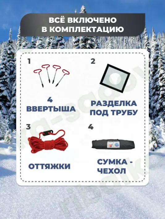 Сменная термостойкая насадка для выхода дымохода позволяет использовать печи на твердом топливе внутри палатки. Длинная юбка по периметру палатки обеспечивает дополнительную защиту от сквозняков и неблагоприятных погодных условий. Ввертыши и веревка входят в комплект.