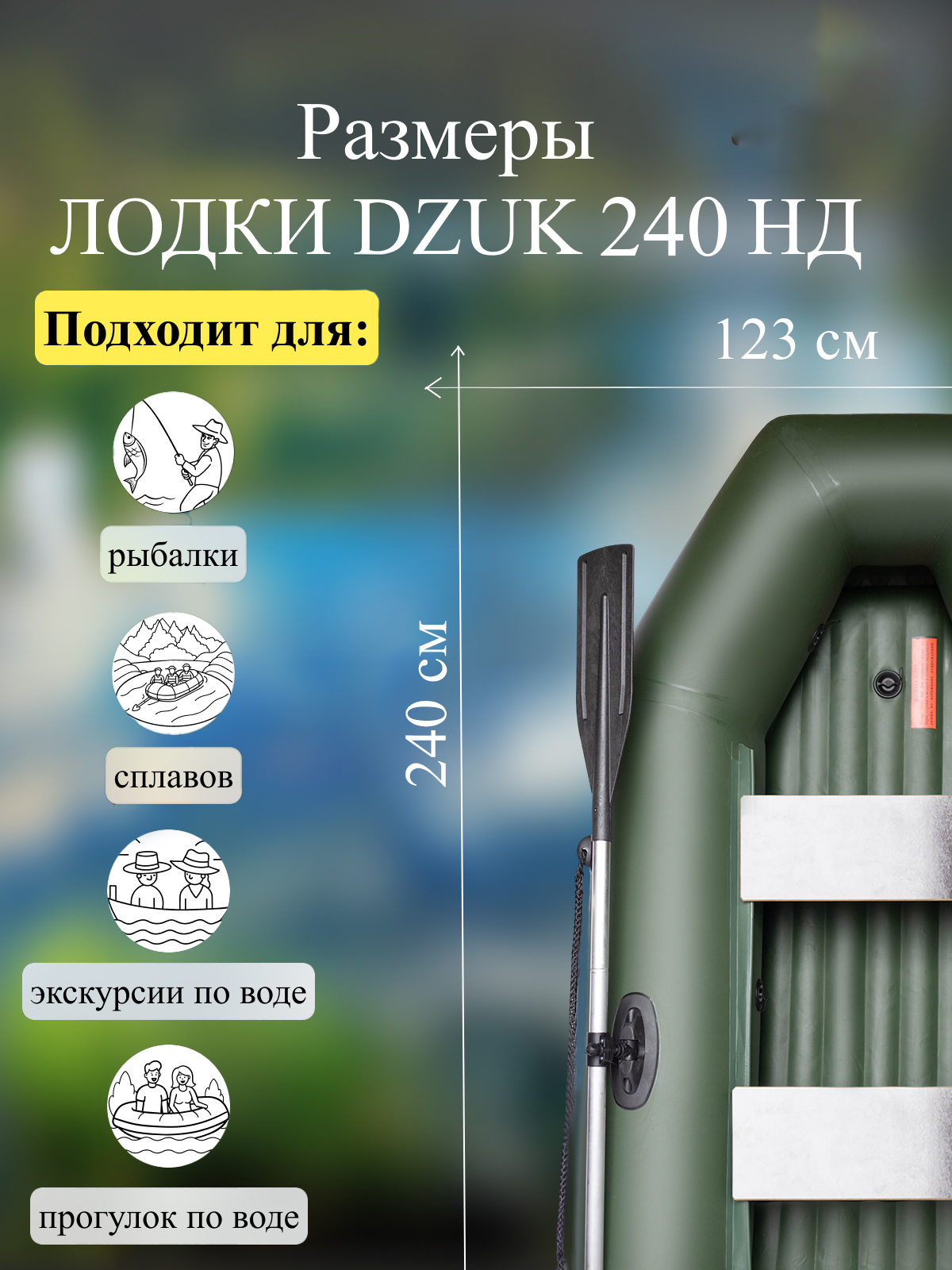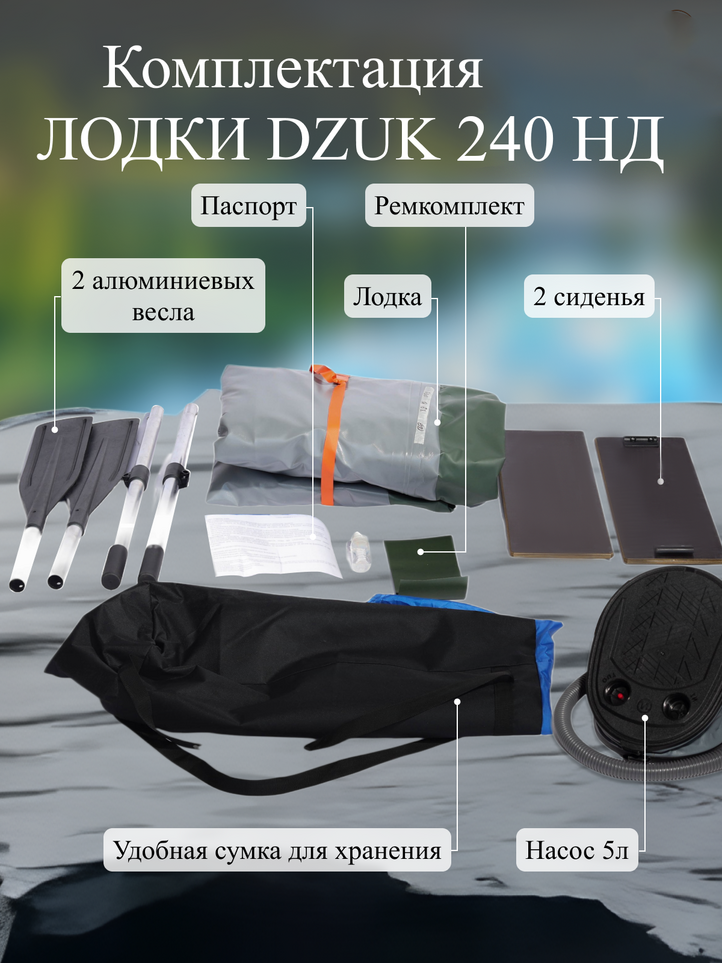Комплектация лодки DZUK 240 НД включает в себя весла, насос, ремкомплект и сумку для транспортировки. Возможность установки навесного транца позволяет использовать лодку с маломощным лодочным мотором, расширяя диапазон применения и повышая скорость передвижения по воде. Данная модель является оптимальным выбором для рыбалки, охоты и активного отдыха на воде, сочетая в себе компактность, надежность и функциональность.