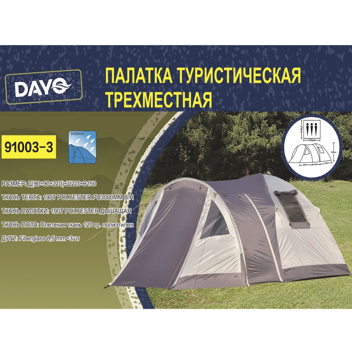 Палатка DAYO трёхместная, (90+90+210)х230х170см